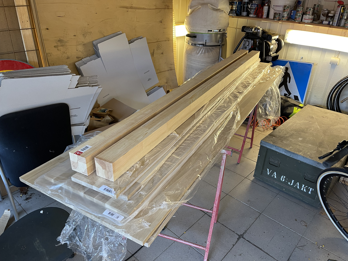 Sen så köpte jag allt virke, limträskivor i ek och stolpar i furu för dom ville jag ändå mörkbetsa. Virket blev liggandes bra länge innan jag satte igång, köpte faktiskt virket mellan näst sista och sista skissen.