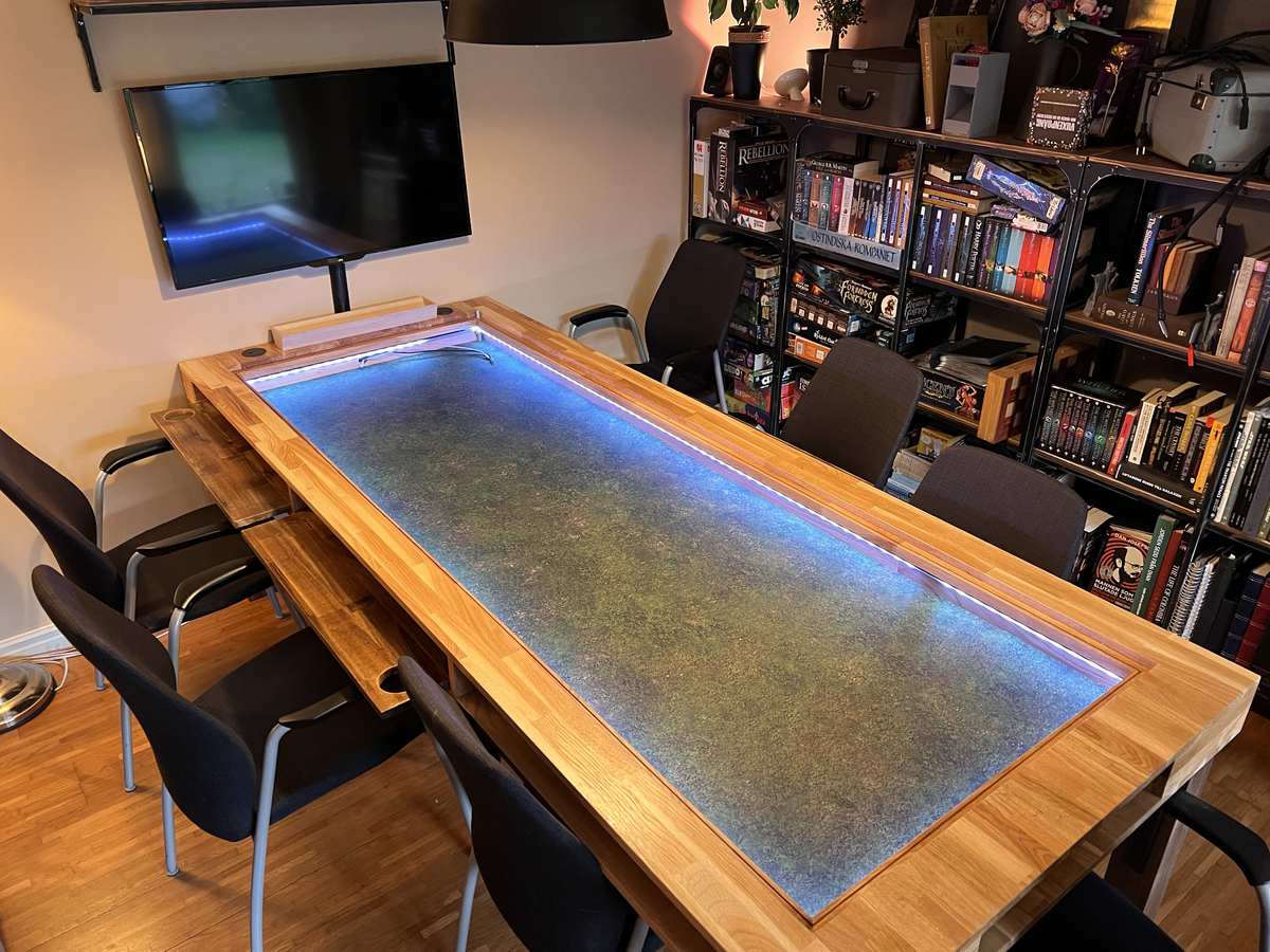 Jag skrev först för nästan exakt två år sedan att jag ville bygga ett spelbord. Vi spelar en hel del rollbrädspel och har använt ett gammalt extrabord jag byggde för fem år sen inför julafton. Det bordet är superfint, men blir lätt överfullt med saker när vi spelar, så ett lite större bord behövdes.