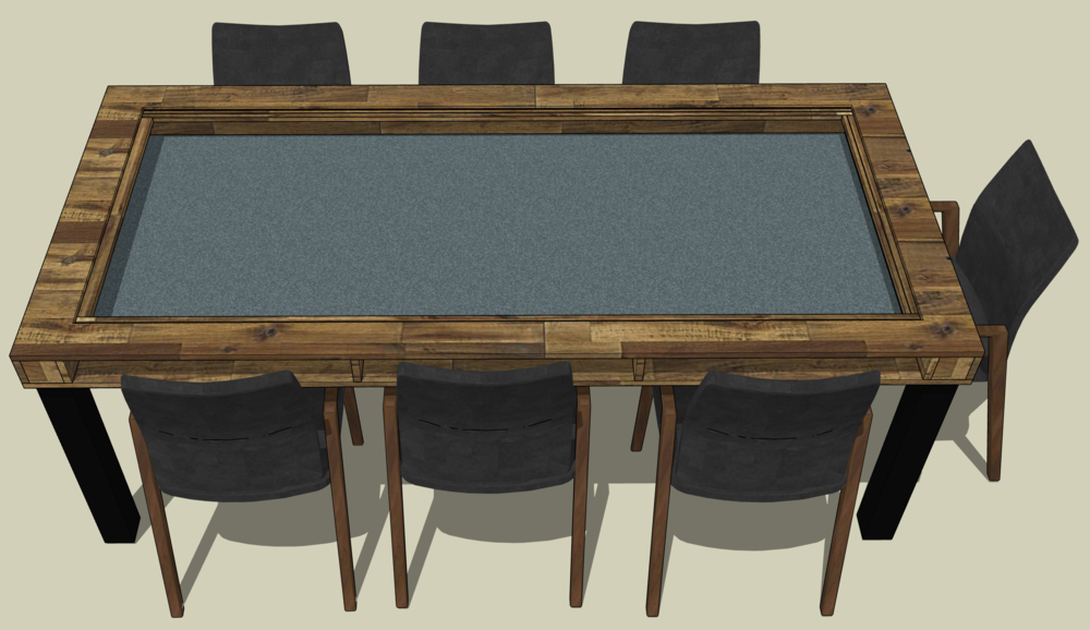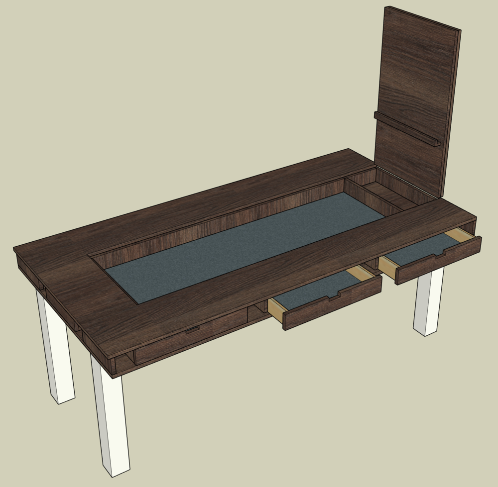 Nästa skiss så har jag ändrat mig angående sargens storlek och det är mer som ett biljardbord. Lådorna är därmed borta, men tanken med att sista skivan är uppfällbar och har hållare för iPad är kvar.
