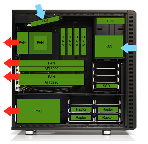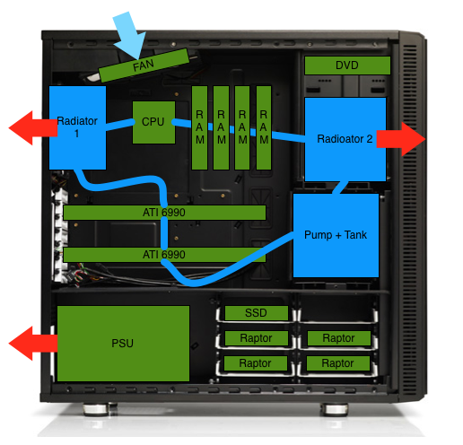 Detta är tanken. Pump och tank hamnar på det undre 5,25"-utrymmet, varpå en 10mm-slang leder vattnet till de två grafikkorten och sedan in i en radiator och sedan rakt in i en radiator som avger värme ut på baksidan av datorn, sedan in i processorn och sen till andra radiatorn och sedan tillbaka till pumpen och tanken. Define XL har plats för en riktigt stor radiator i baksidan och när man offrar 5,25 och HDD-platserna i fronten så får man rum med hur mycket som helst där med. Fläkten i taket behålls för RAM och moderkort, och PSU har ju kvar sin fläkt givetvis, men annars så kommer den här datorn knappt låta alls. Sweet!