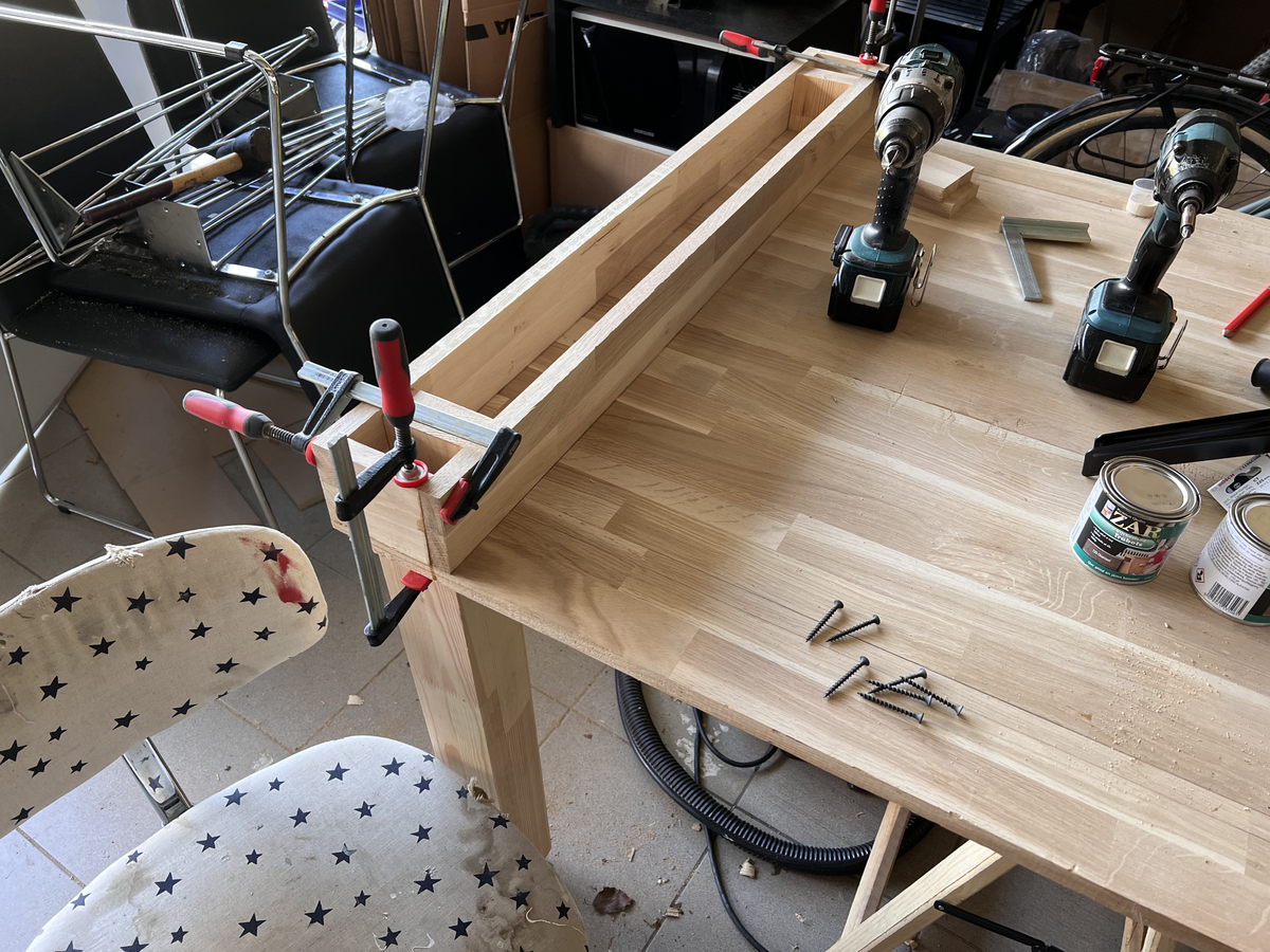 Efter hål för benen så kunde sargbitarna börja kapas till och limmas samt skruvas fast.