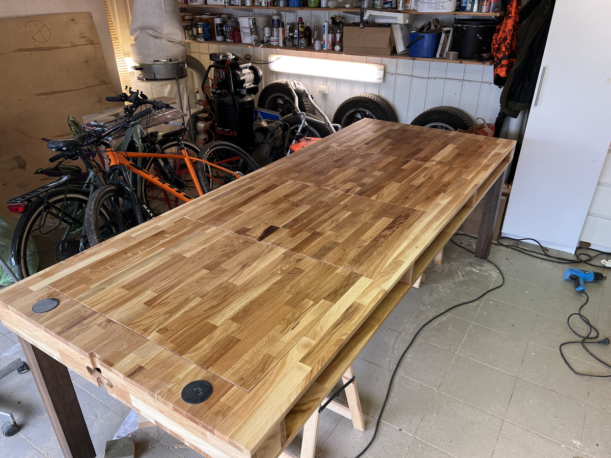 Virket fanns inte i rätt bredd (drygt en meter) så första steget var att limma ihop två skivor till en.